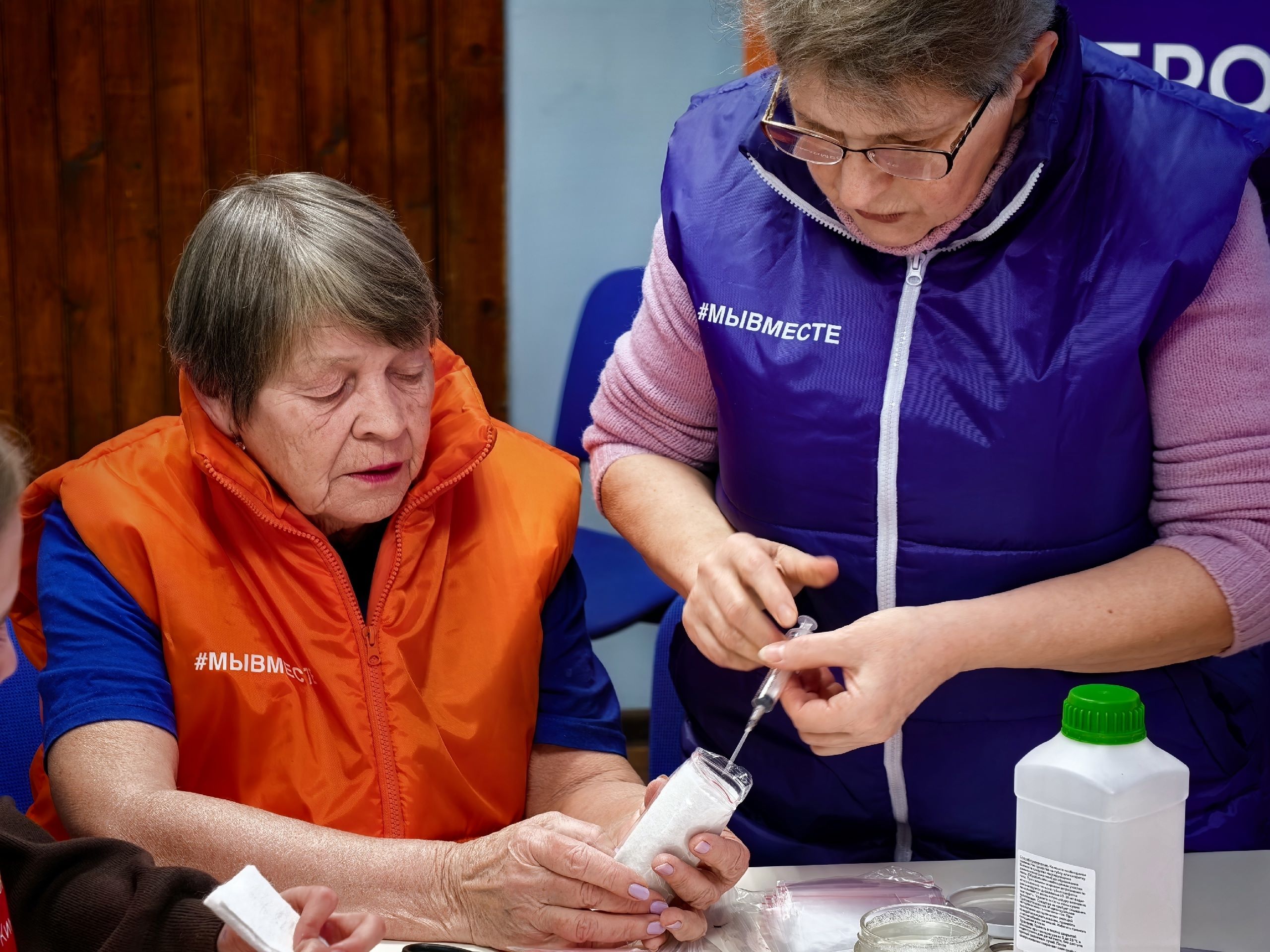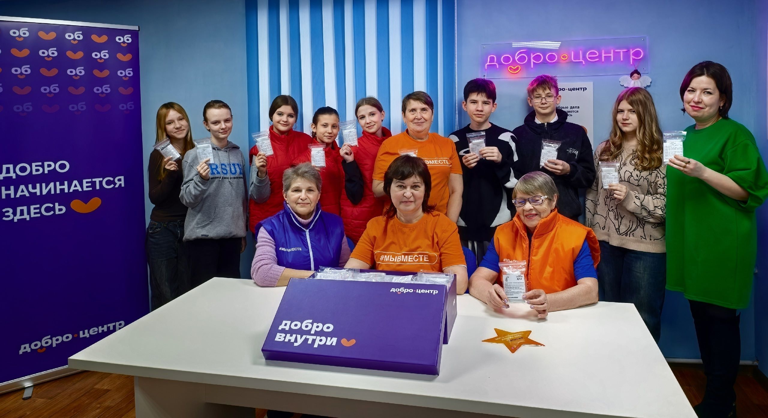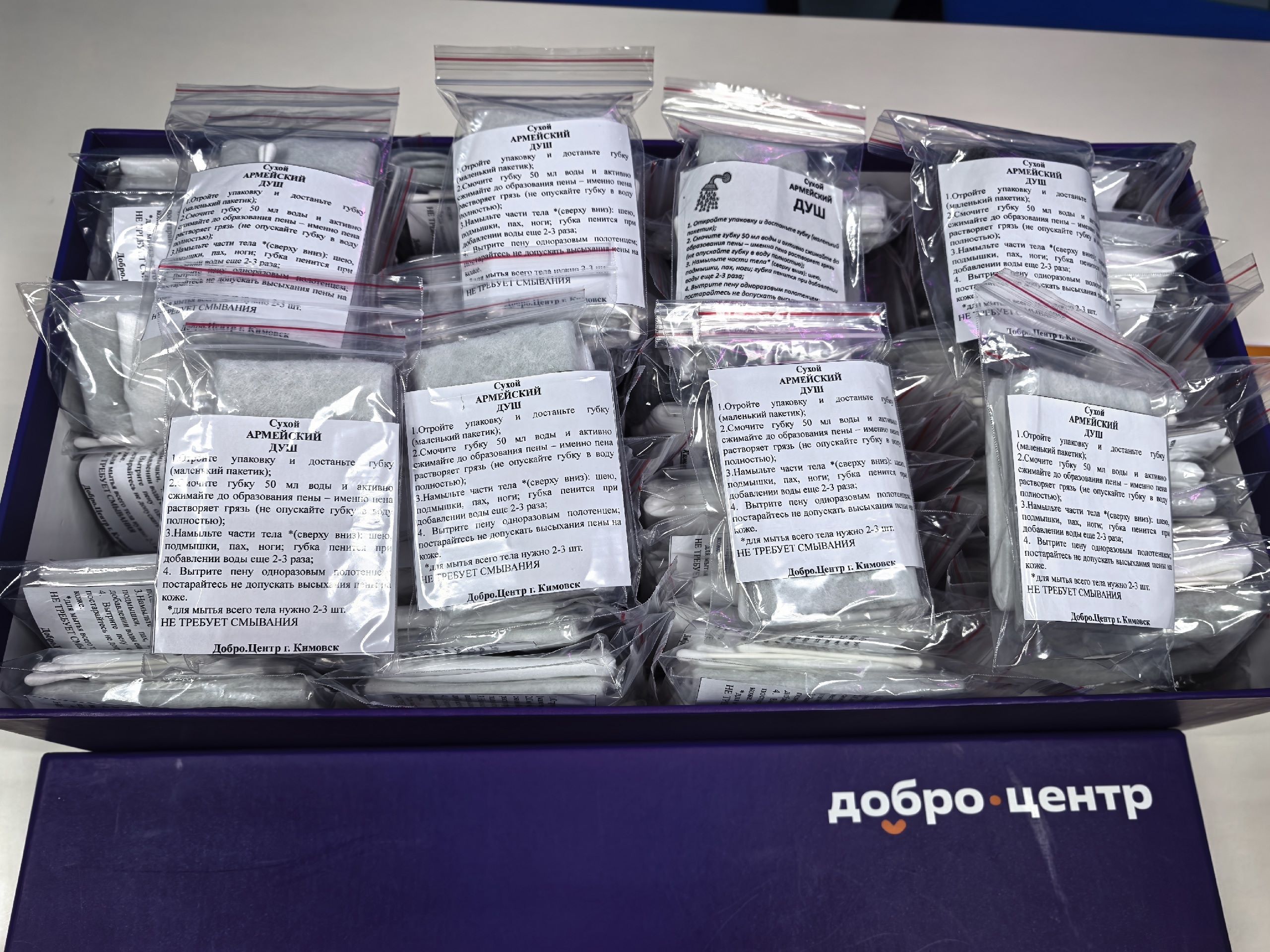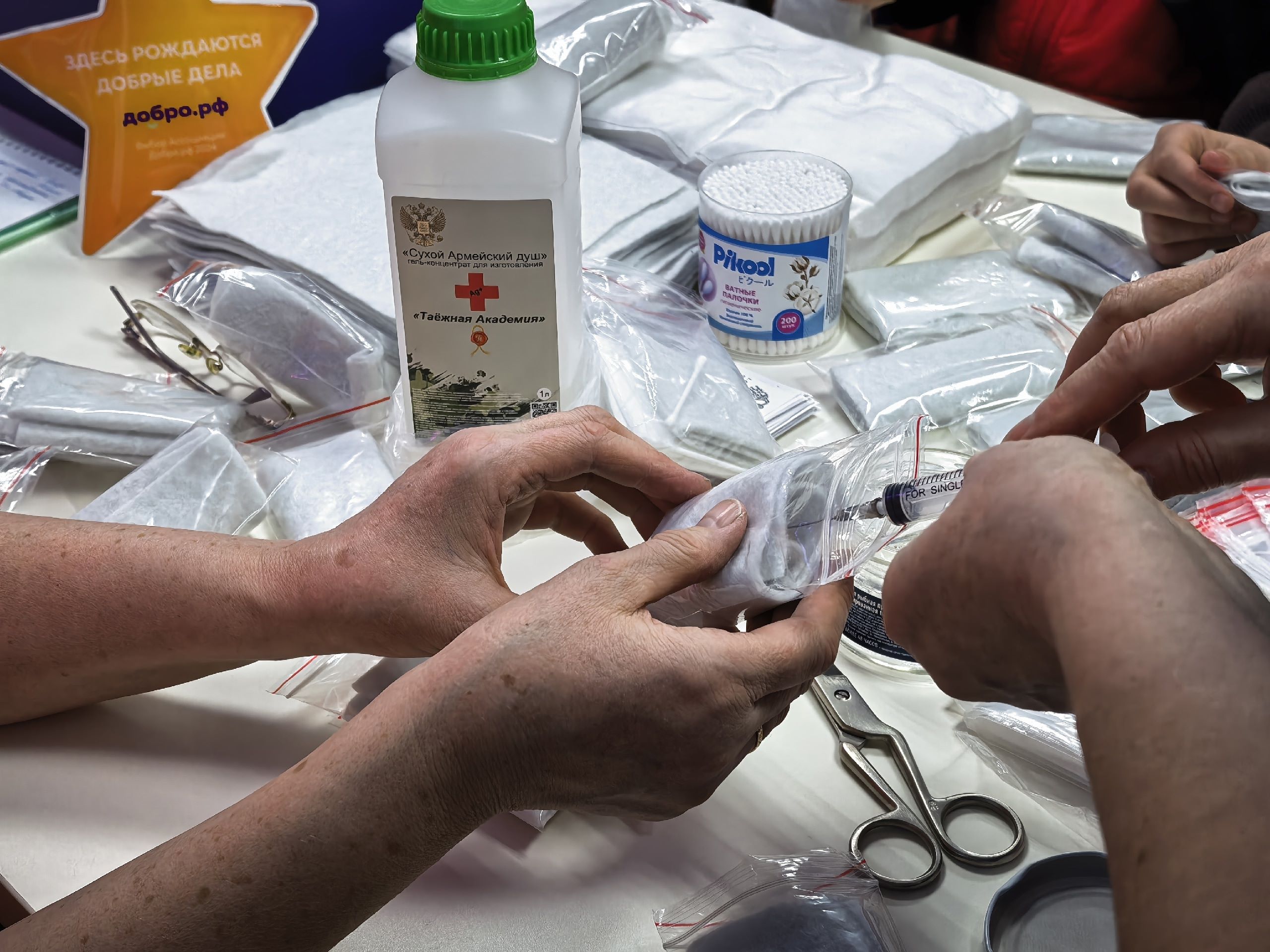 В рамках Всероссийской акции взаимопомощи МЫВМЕСТЕ кимовские «серебряные» волонтеры Добро.Центра Нина Левкина и Людмила Кудряшова вместе с коллегами из веневского Добро.Центра Ольгой Волковой и Евгенией Новиковой организовали для молодежи мастер-класс по изготовлению сухого армейского душа для военнослужащих.