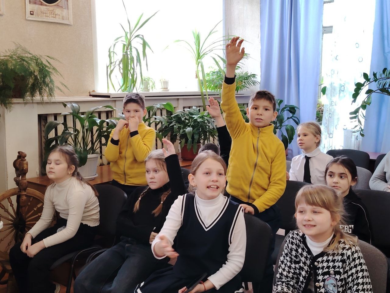 Далее третьеклассники средней школы № 7 активно включились в интерактивную викторину. Им предстояло проявить свою эрудицию, угадывая элементы культуры народов, проживающих на территории РФ (татар, башкир, чеченцев, бурят, народов Севера): национальные головные уборы, инструменты и особенности обрядов.