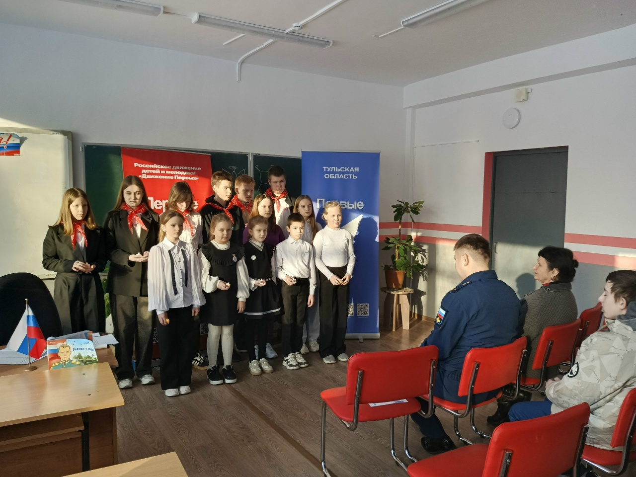 В гости к школьникам приехал настоящий герой – Дмитрий Кувшинов. В школе с волнением и трепетом приветствовали помощника начальника отделения военного комиссариата города Кимовска и Кимовского района Тульской области, кавалера ордена Мужества.