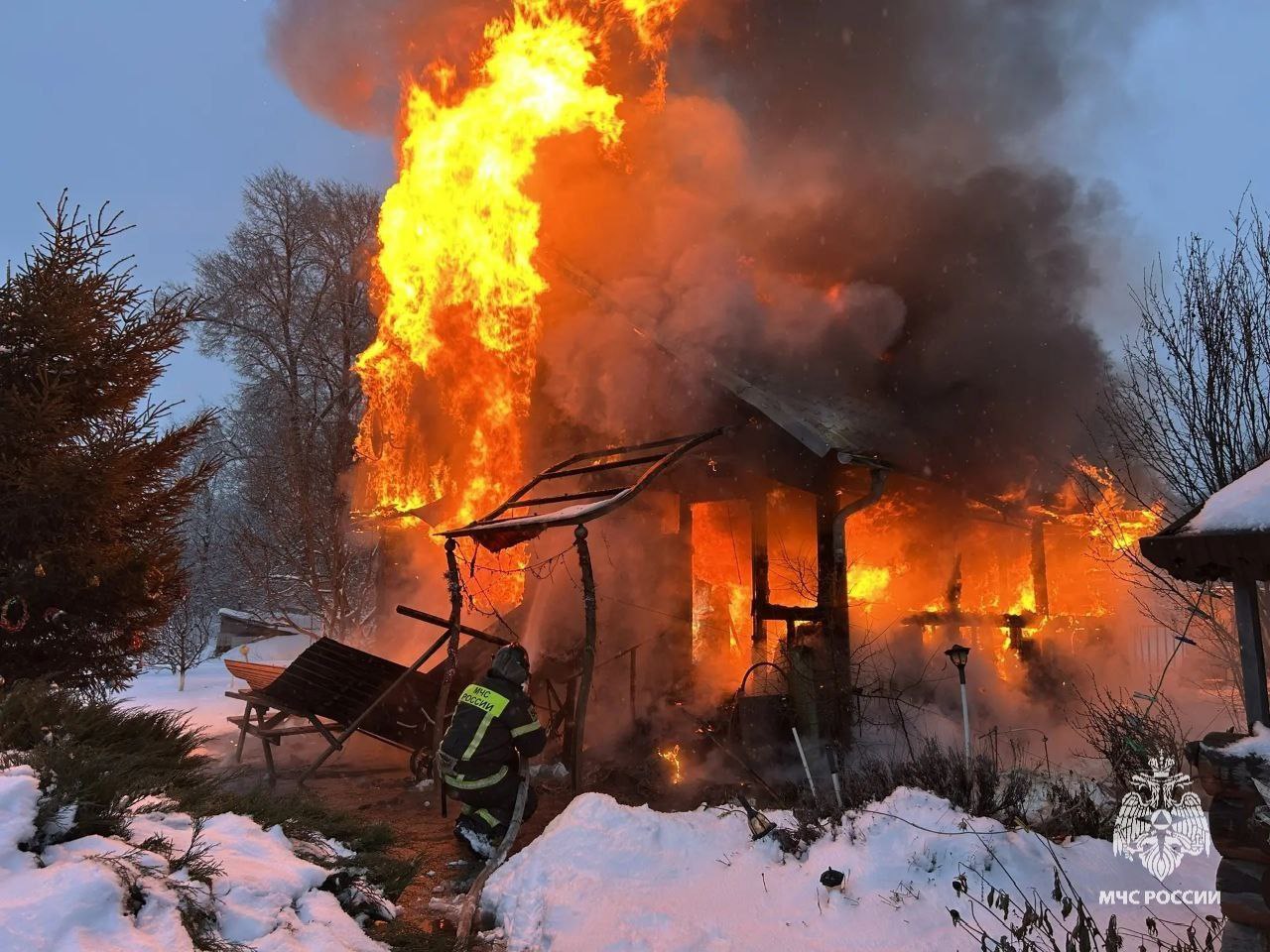 Огонь вспыхнул в бане. Площадь возгорания составила 64 квадратных метра. С огнем боролись 11 пожарных на трех единицах техники. К счастью, обошлось без пострадавших.