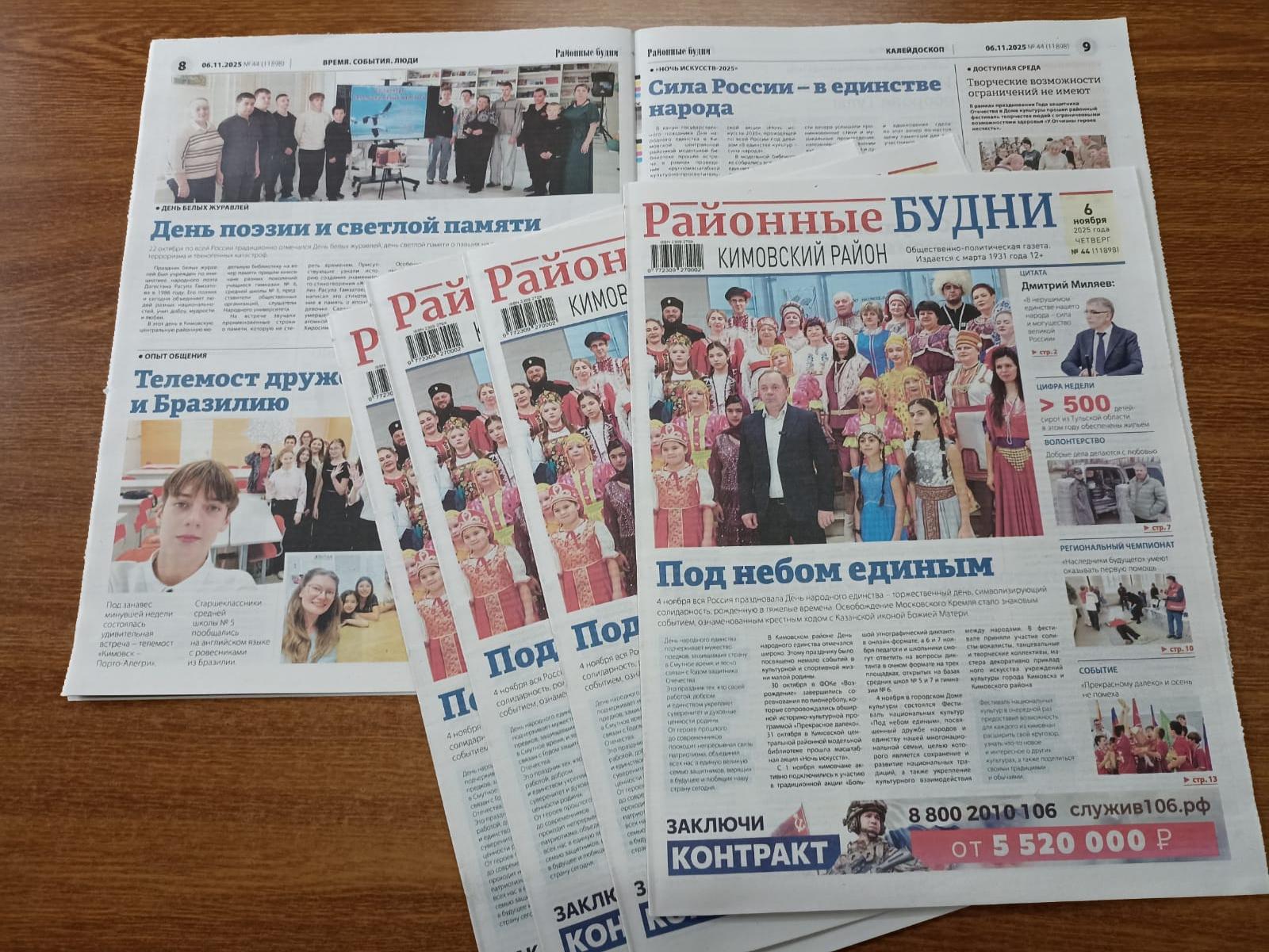 Первый ноябрьский номер газеты «Районные будни. Кимовский район» открывает материал, посвященный празднованию Дню народного единства.