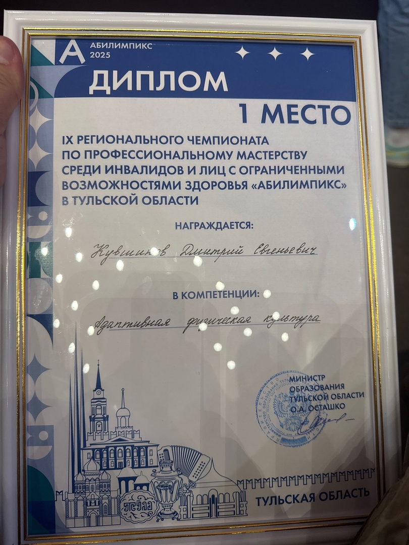 Диплом победителя и медаль в компетенции «Адаптивная физическая культура» был вручен кимовчанину Дмитрию Кувшинову, который сразу же по возвращении домой начал подготовку к участию в следующем турнире – Открытом Кубке Тульской области по спорту лиц с поражением опорно-двигательного аппарата среди участников специальной военной операции. Его старт состоится в ближайшую субботу.