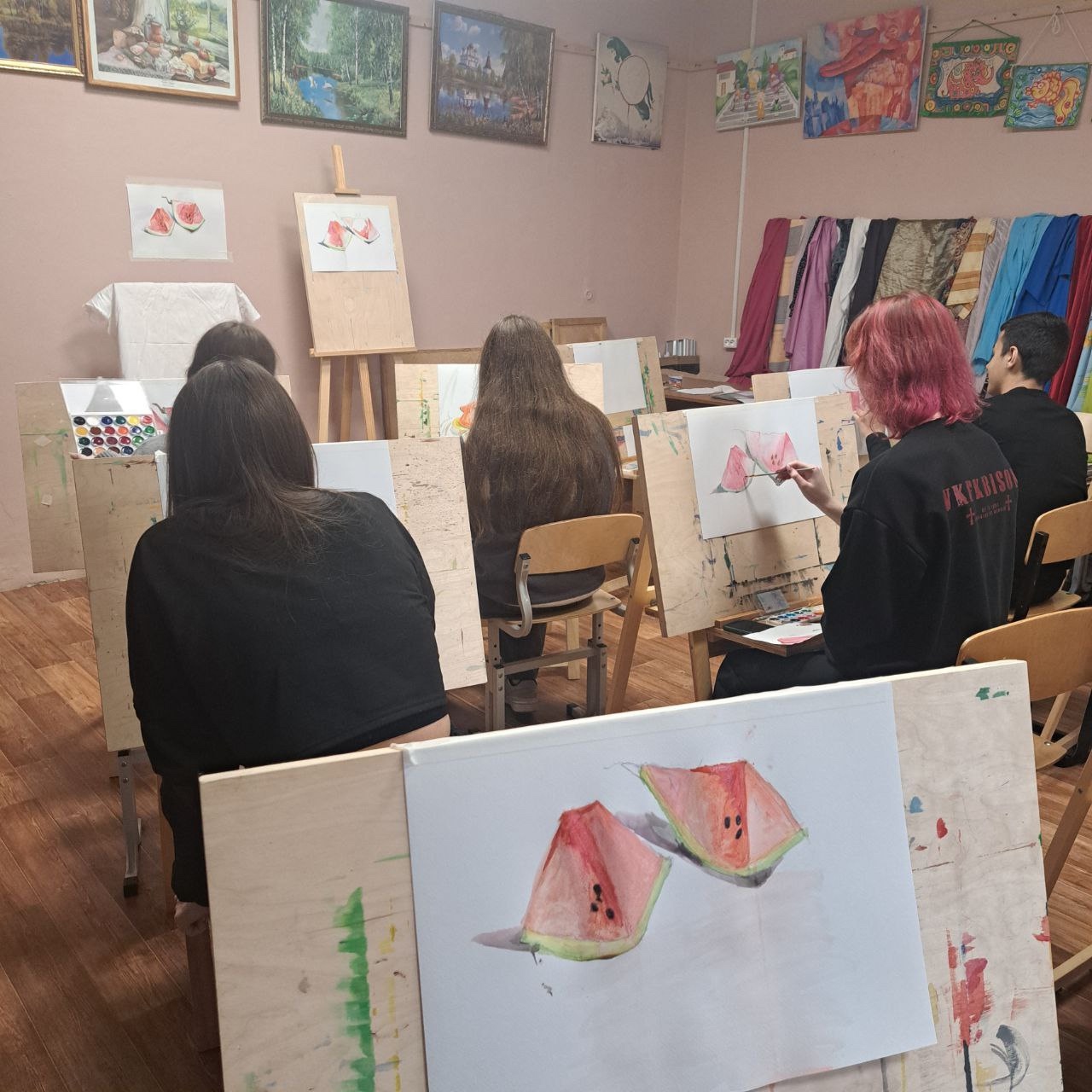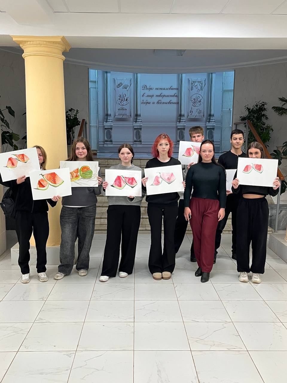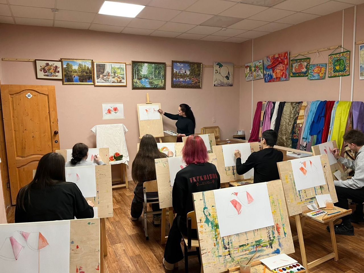 В рамках Всероссийской программы «Пушкинская карта» преподаватель художественного отделения Кимовской детской школы искусств - Надежда Арнаутова провела интереснейший мастер-класс по рисованию акварелью «Сочный арбуз» для учеников средней школы № 5.