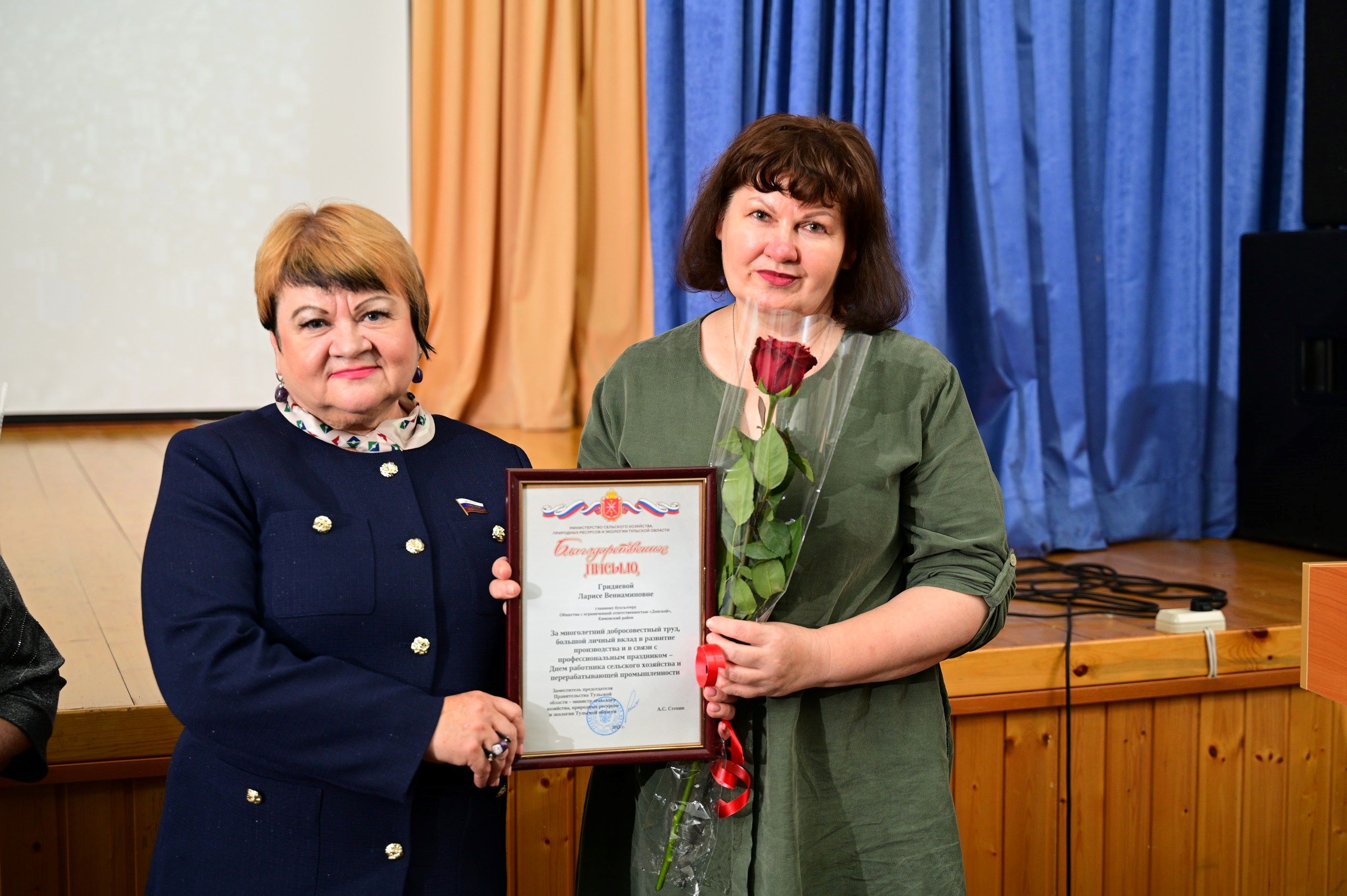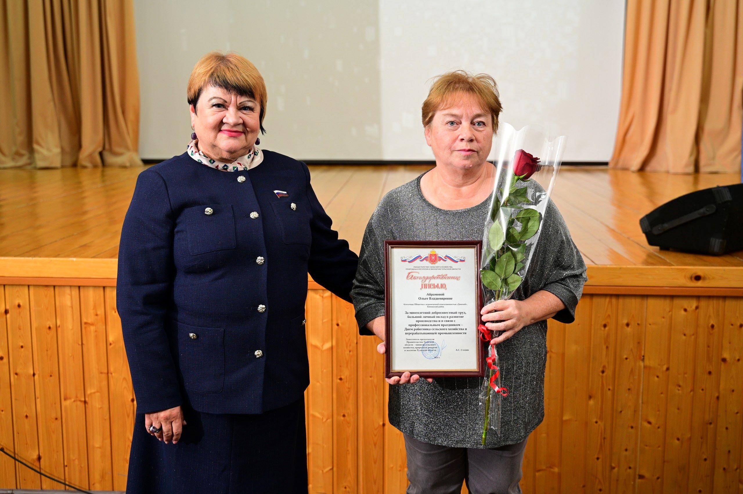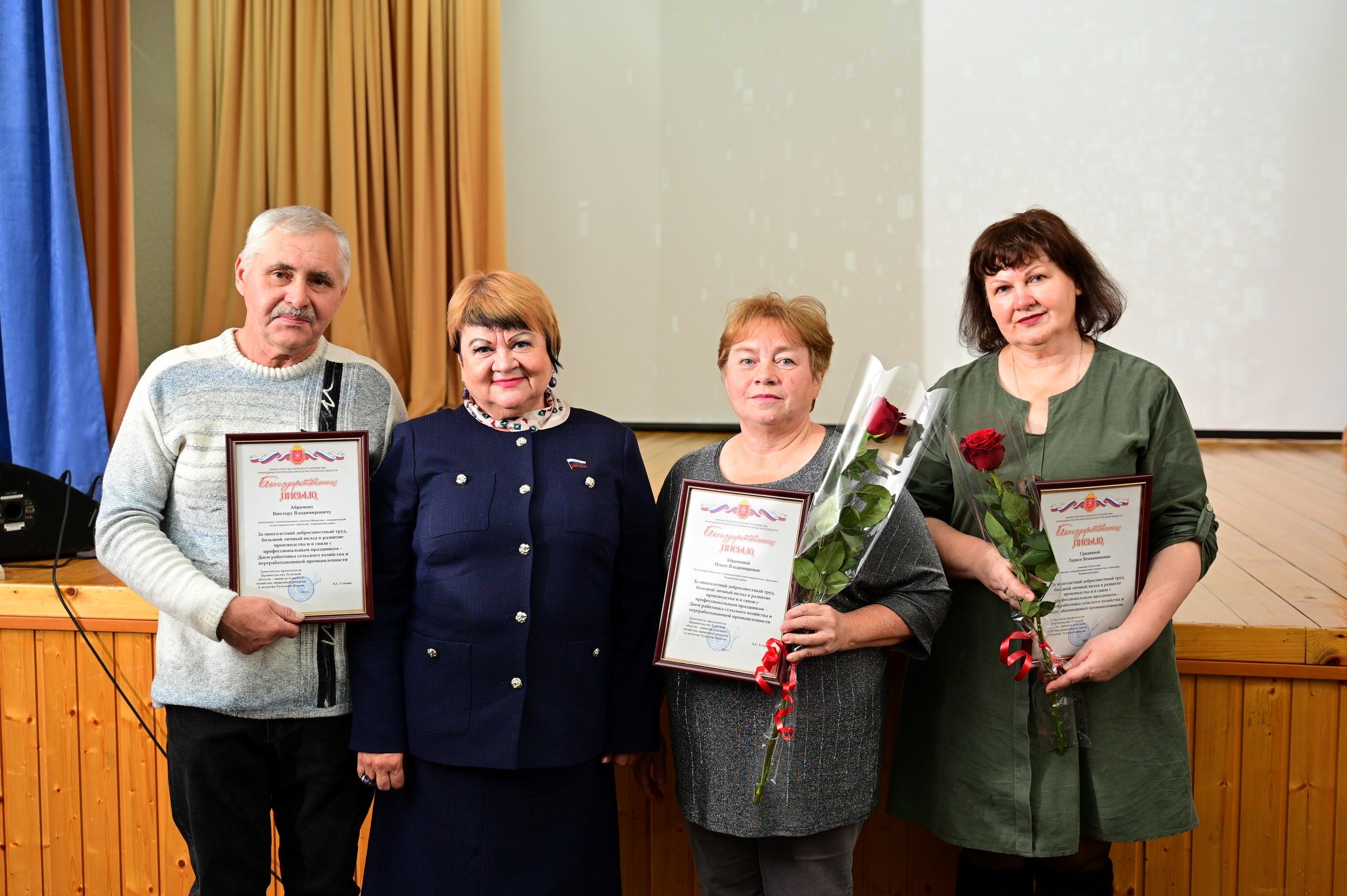 Благодарственным письмом министерства сельского хозяйства, природных ресурсов и экологии Тульской области были награждены начальник электросилового участка Виктор Абрамов; бухгалтер Ольга Абрамова; главный бухгалтер Лариса Гридяева.