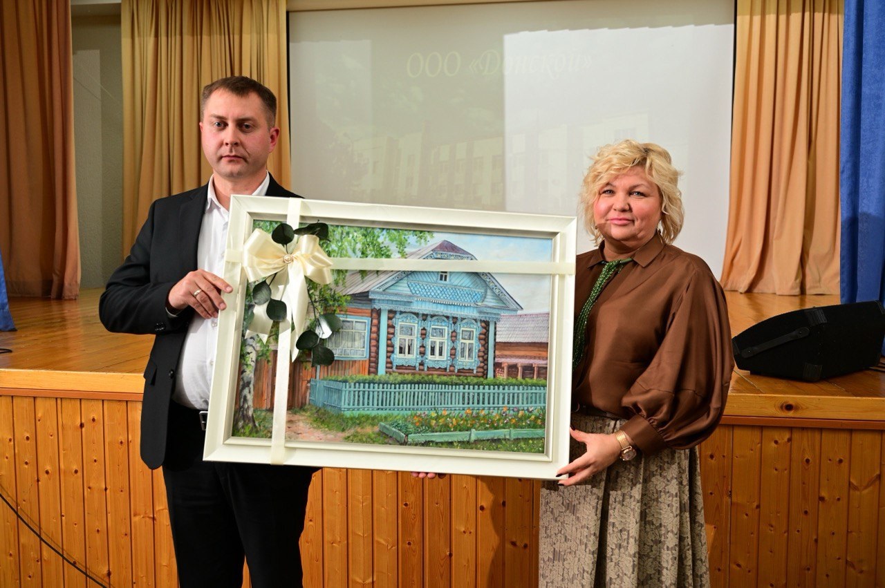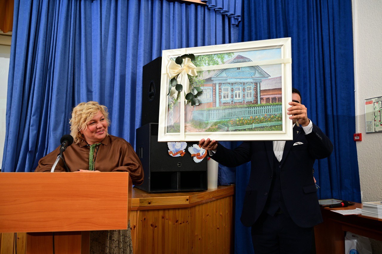 Марина Валерьевна передала в дар руководителю предприятия Александру Момотову картину, отражающую сельскую палитру.