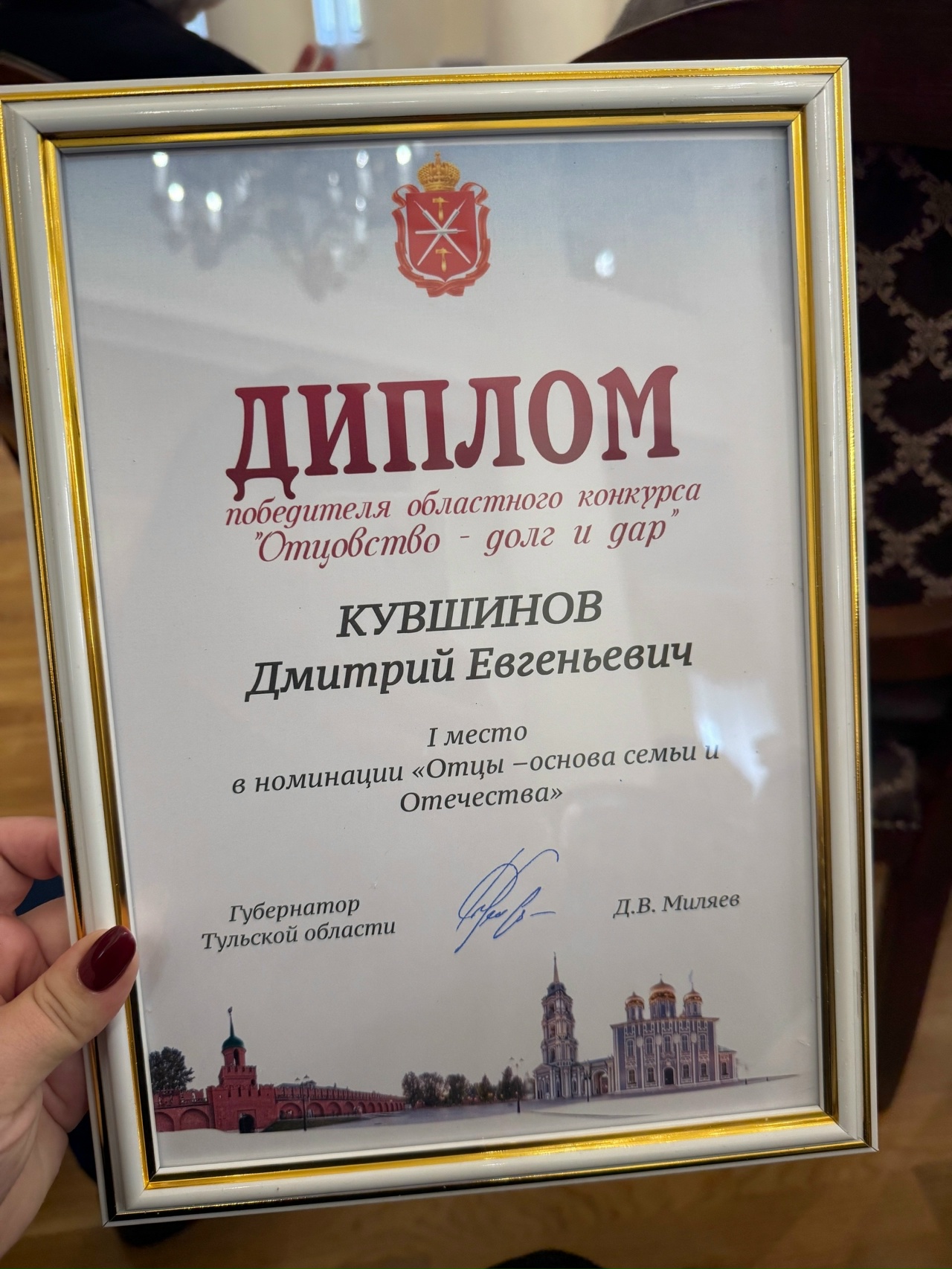 В Туле прошло чествование победителей и призеров регионального конкурса «Отцовство – долг и дар». Среди героев этого события по сложившейся традиции были и кимовчане: победителем в номинации «Отцы – основа семьи и Отечества» в этом году стал ветеран СВО, кавалер ордена Мужества, отец четверых детей Дмитрий Кувшинов.