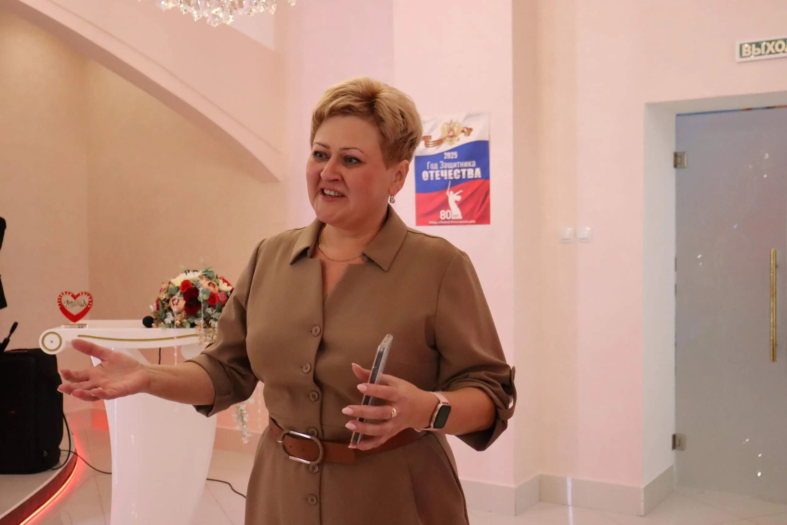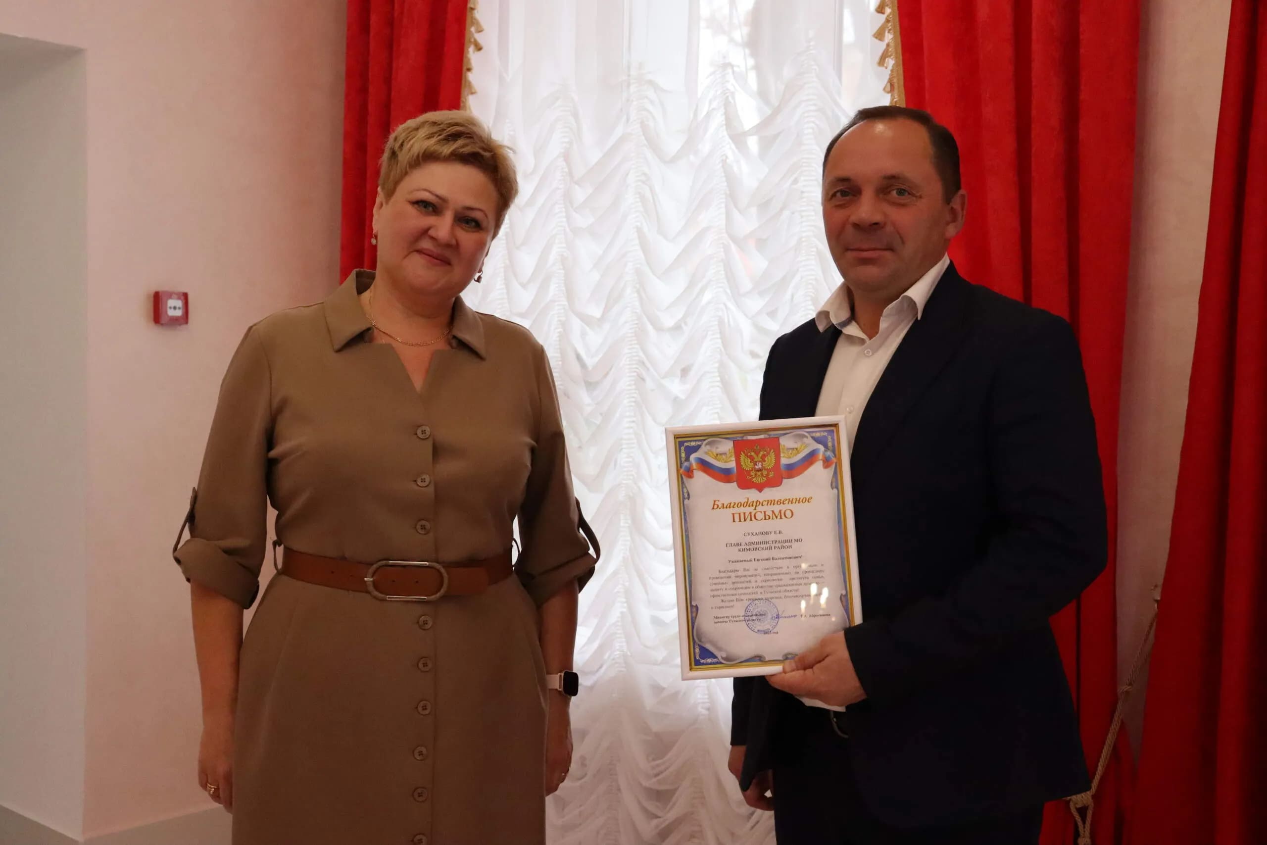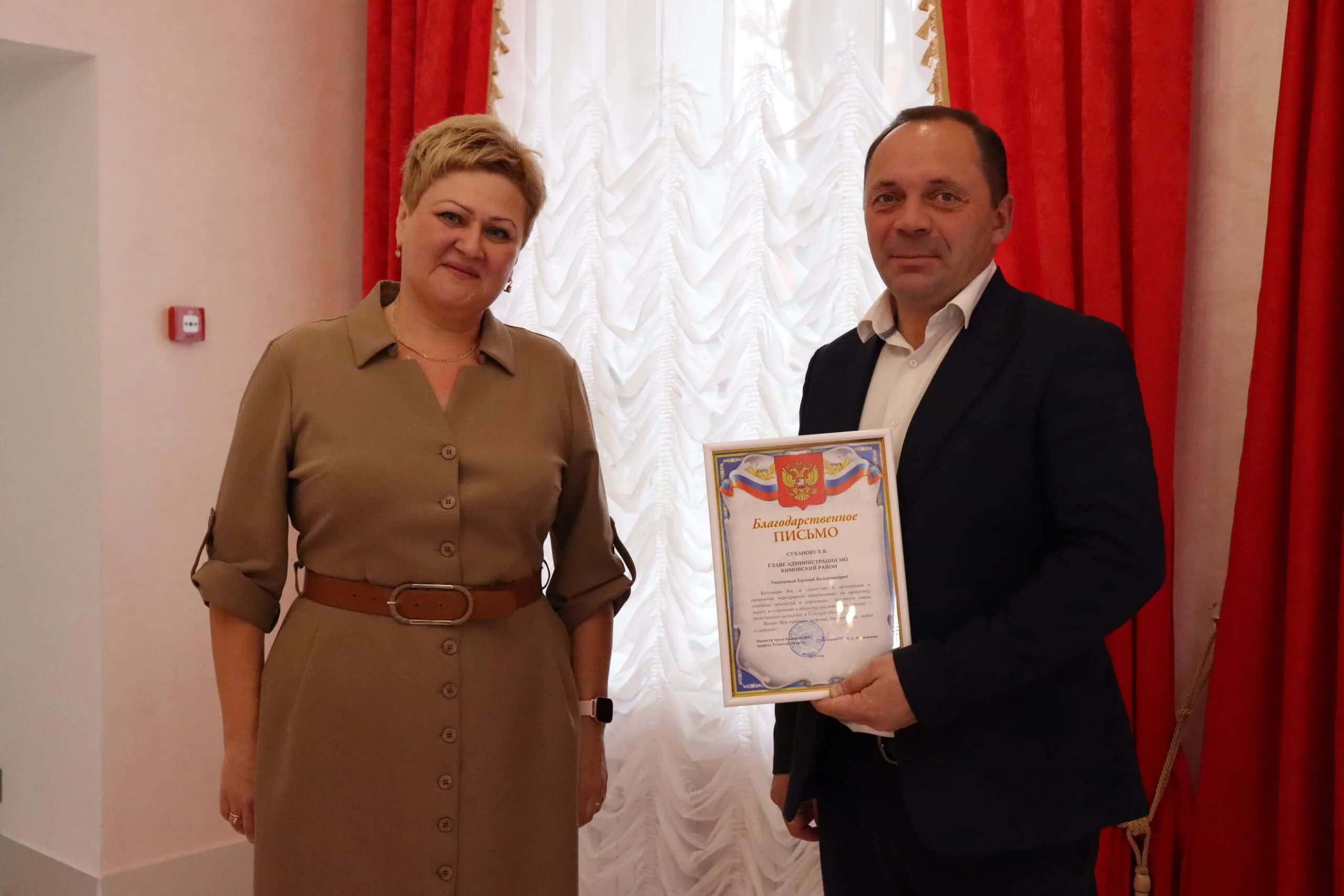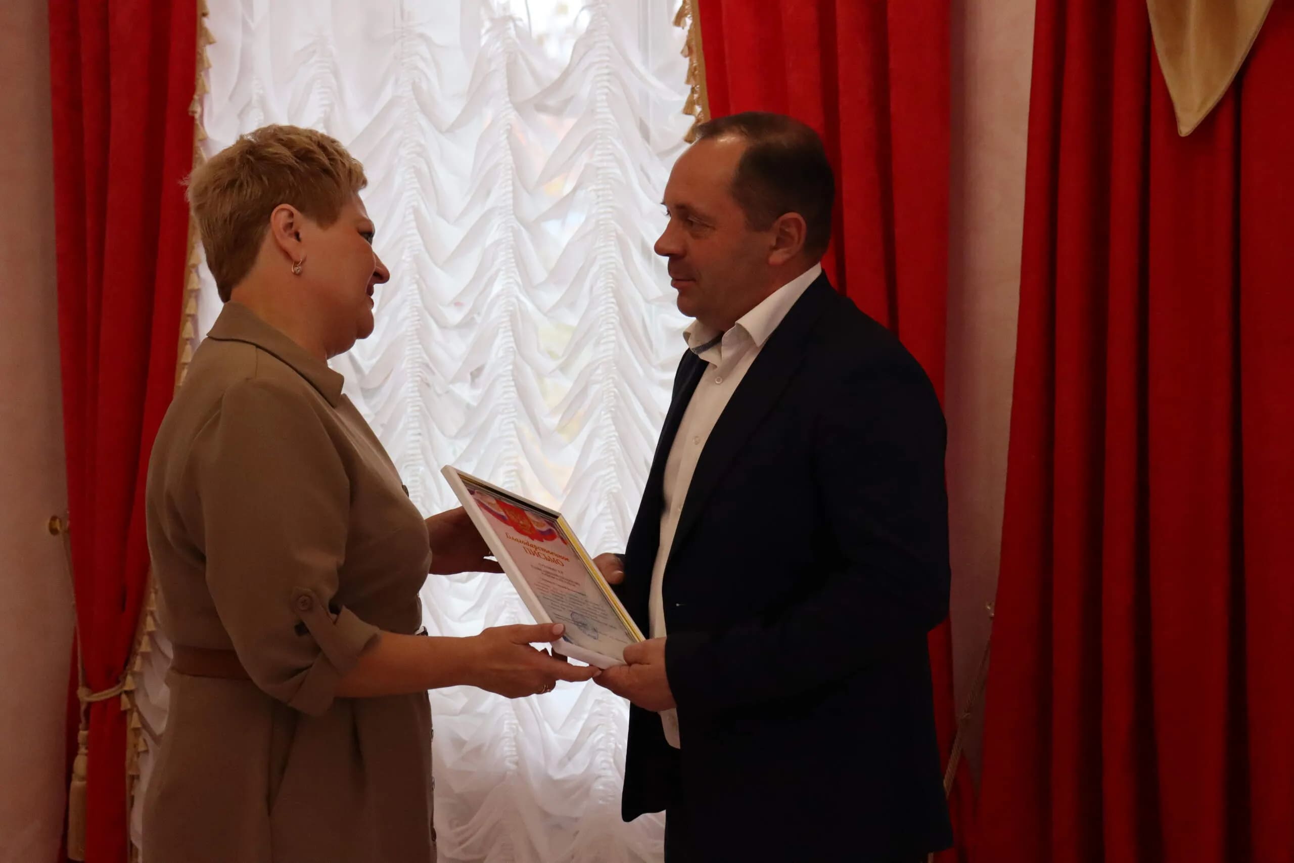 Заместитель начальника отдела ЗАГС по г. Новомосковску, г. Донскому, Веневскому, Кимовскому и Узловскому районам Людмила Орехова вручила благодарственное письмо министерства труда и социальной защиты Тульской области главе районной администрации Евгению Суханову и пожелала всем счастья, успехов и гармонии.