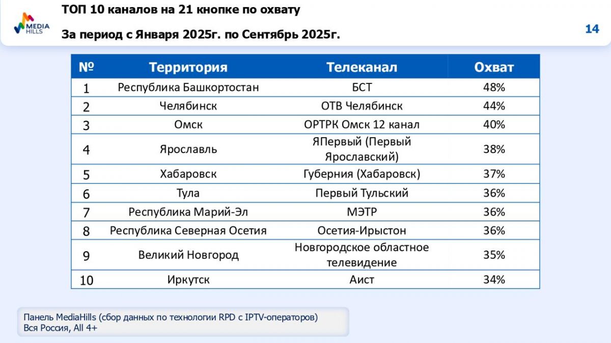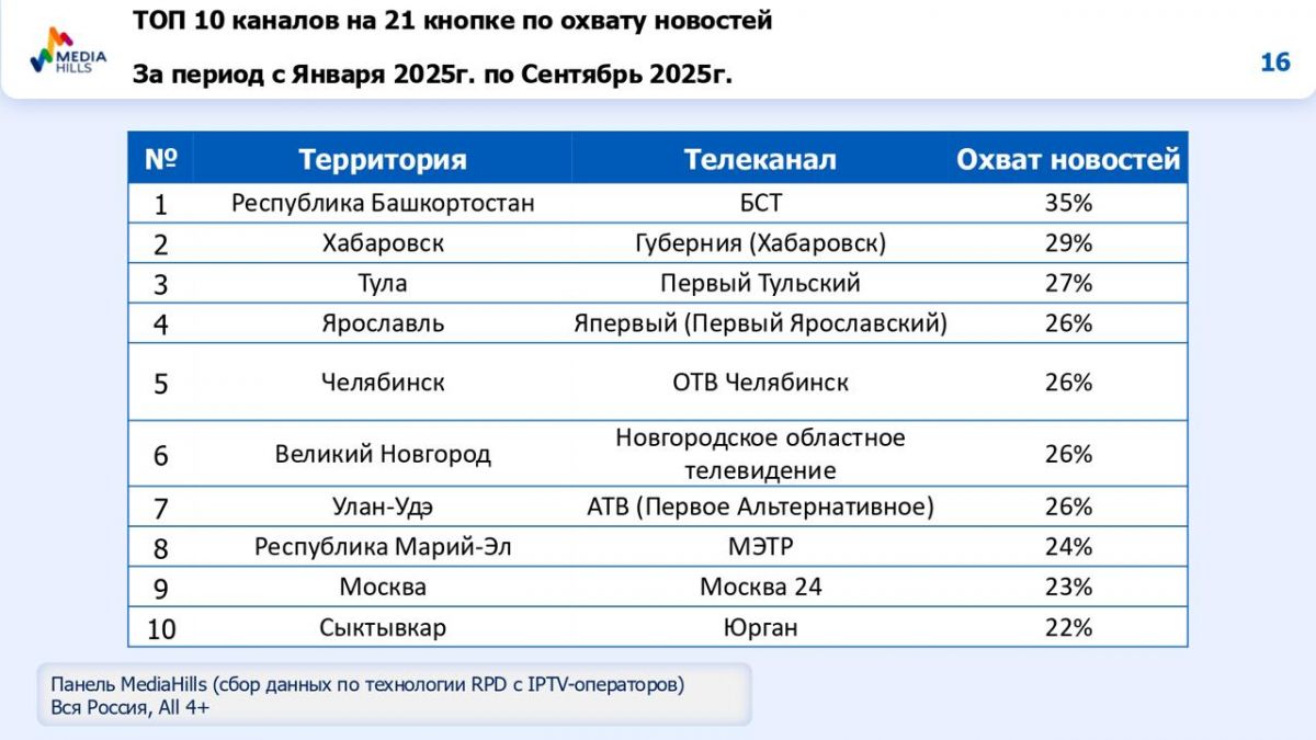 Как сообщает телеканал «Первый Тульский», телеканал «Первый Тульский» вошел в ТОП 3 региональных каналов страны по охвату новостей. Компания MediaHills, которая является измерителем аудитории всех телеканалов России, опубликовала данные за январь-сентябрь 2025 года.