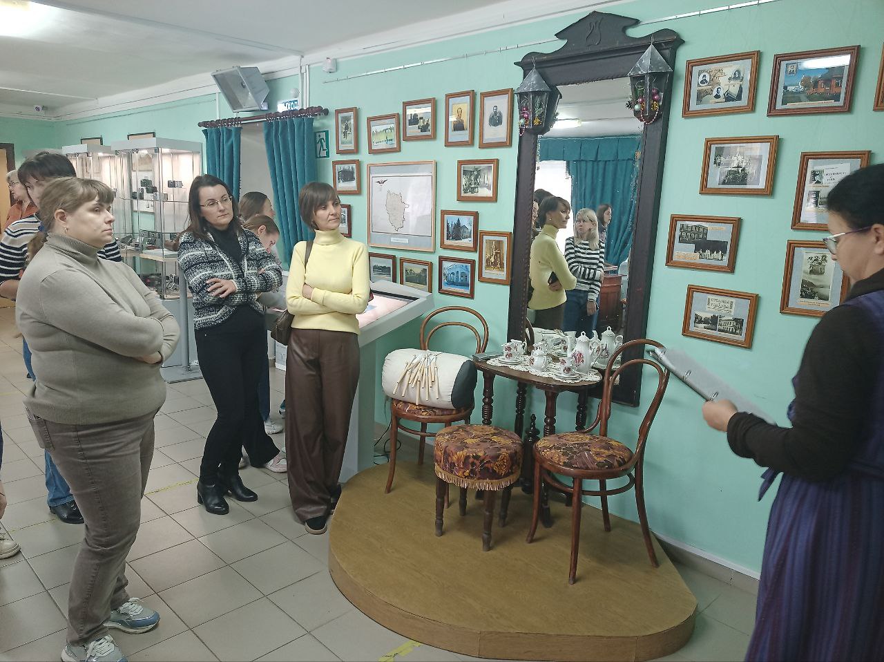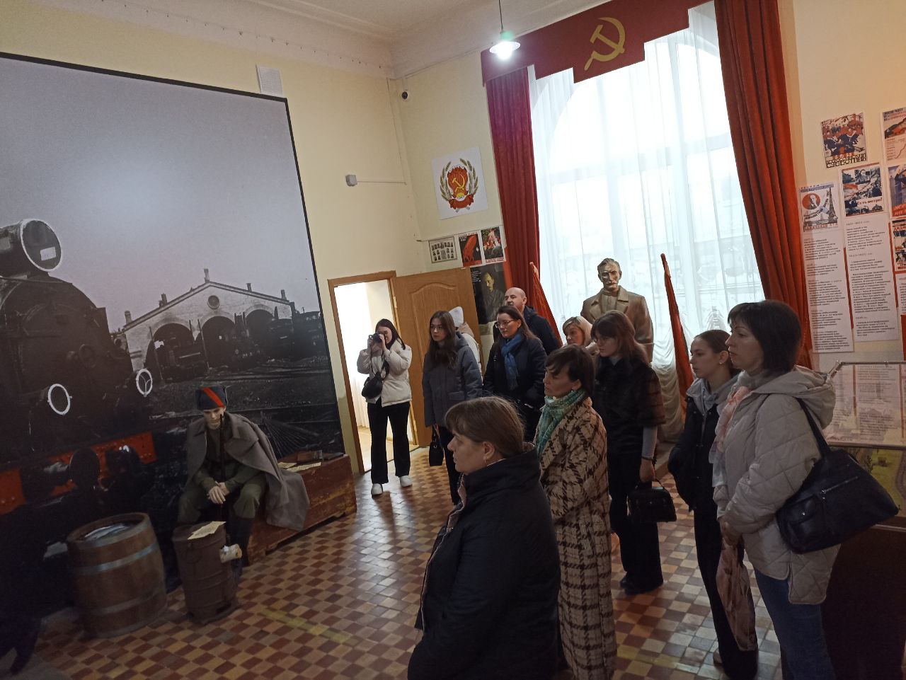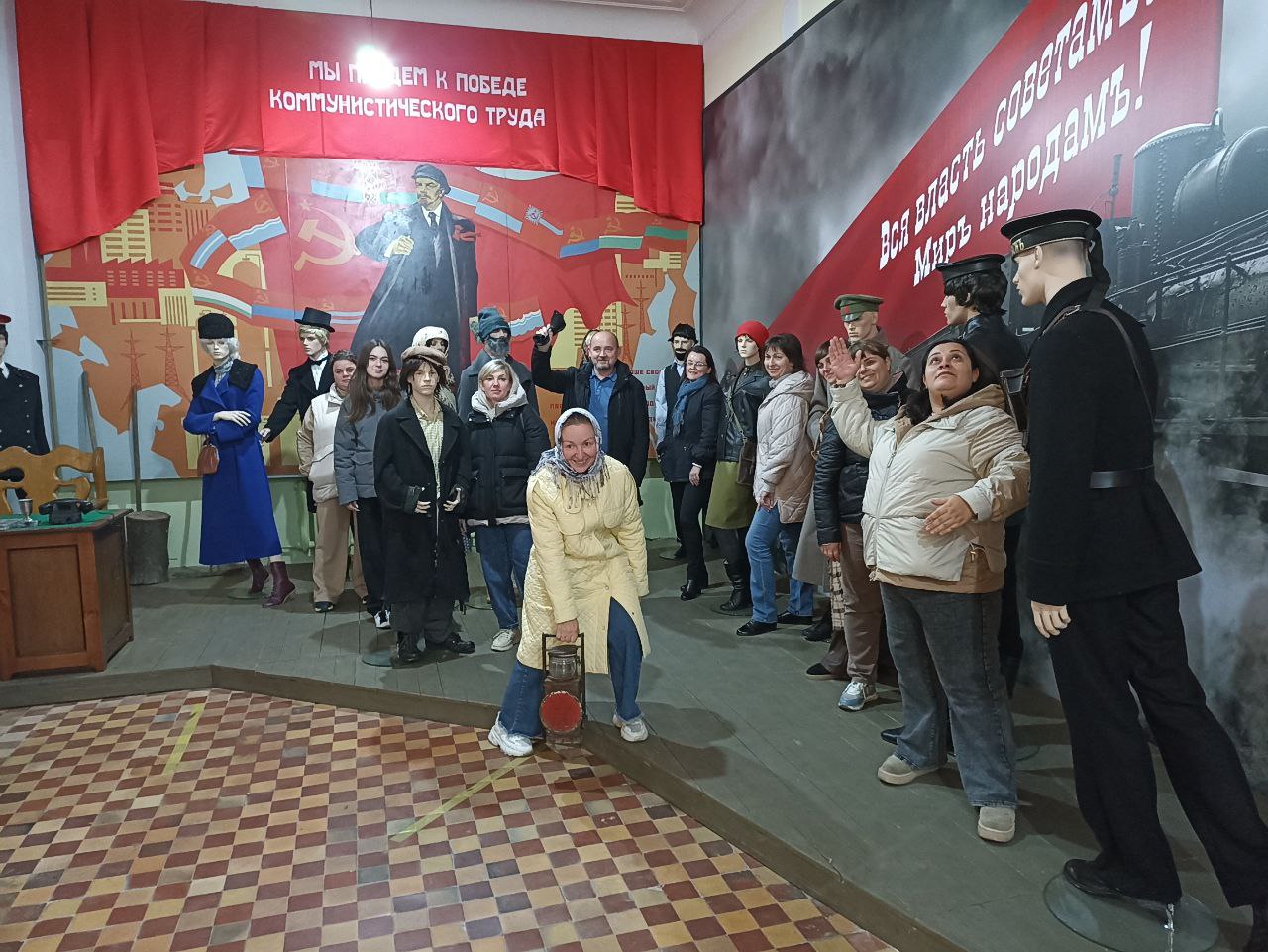 Первую остановку гости Кимовска сделали в музее 100-летия Октябрьской революции на железнодорожной станции, где узнали о жизни Епифанского уезда в революционное время, о значении Сызрано-Вяземской железной дороги в развитии деревни Михайловки (так раньше назывался Кимовск), о становлении советской власти в кимовском районе в сложный послереволюционный период. Педагогов заинтересовала информация о школьном образовании и детско-молодежном движении в советское время. Во время пешеходной прогулки к основному музею на улице Толстого экскурсанты ознакомились с самыми старыми историческими местами и зданиями, сыгравшими в истории населенного пункта значимую роль.