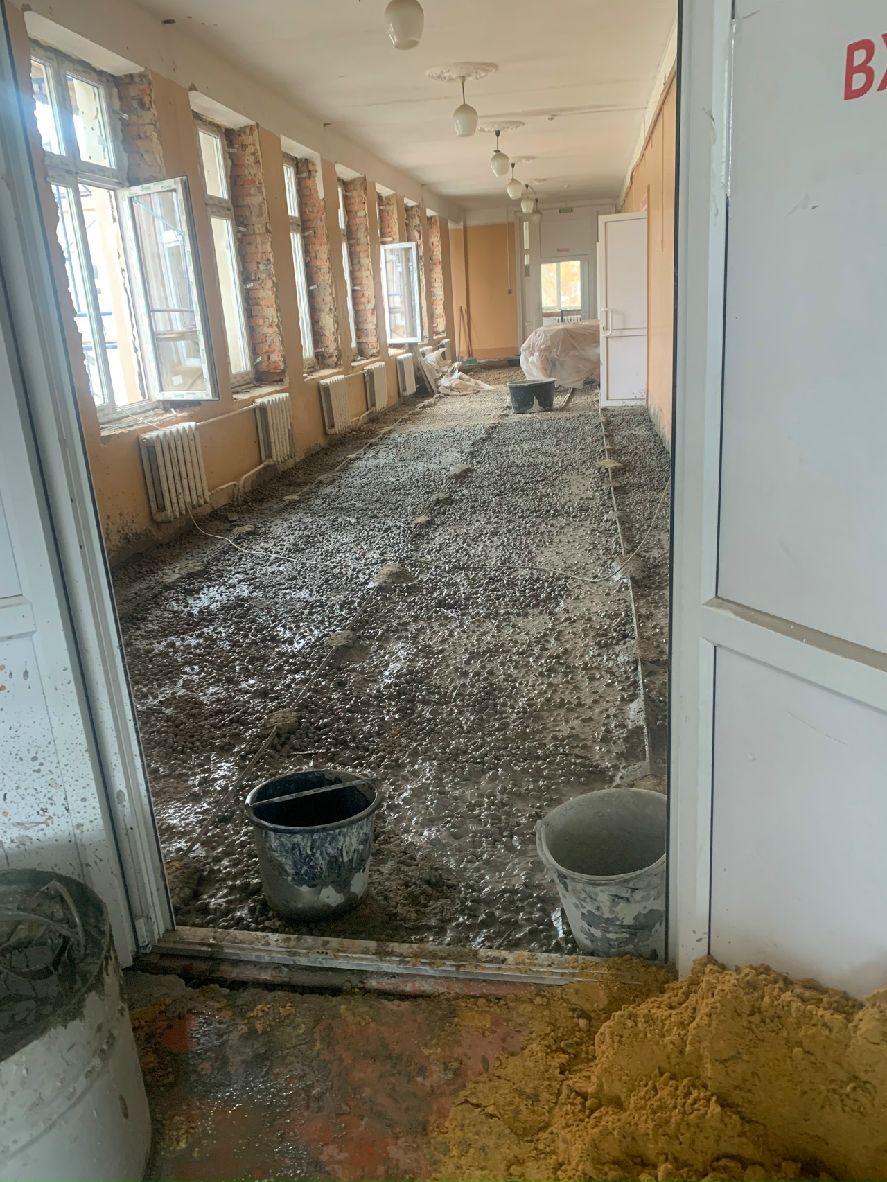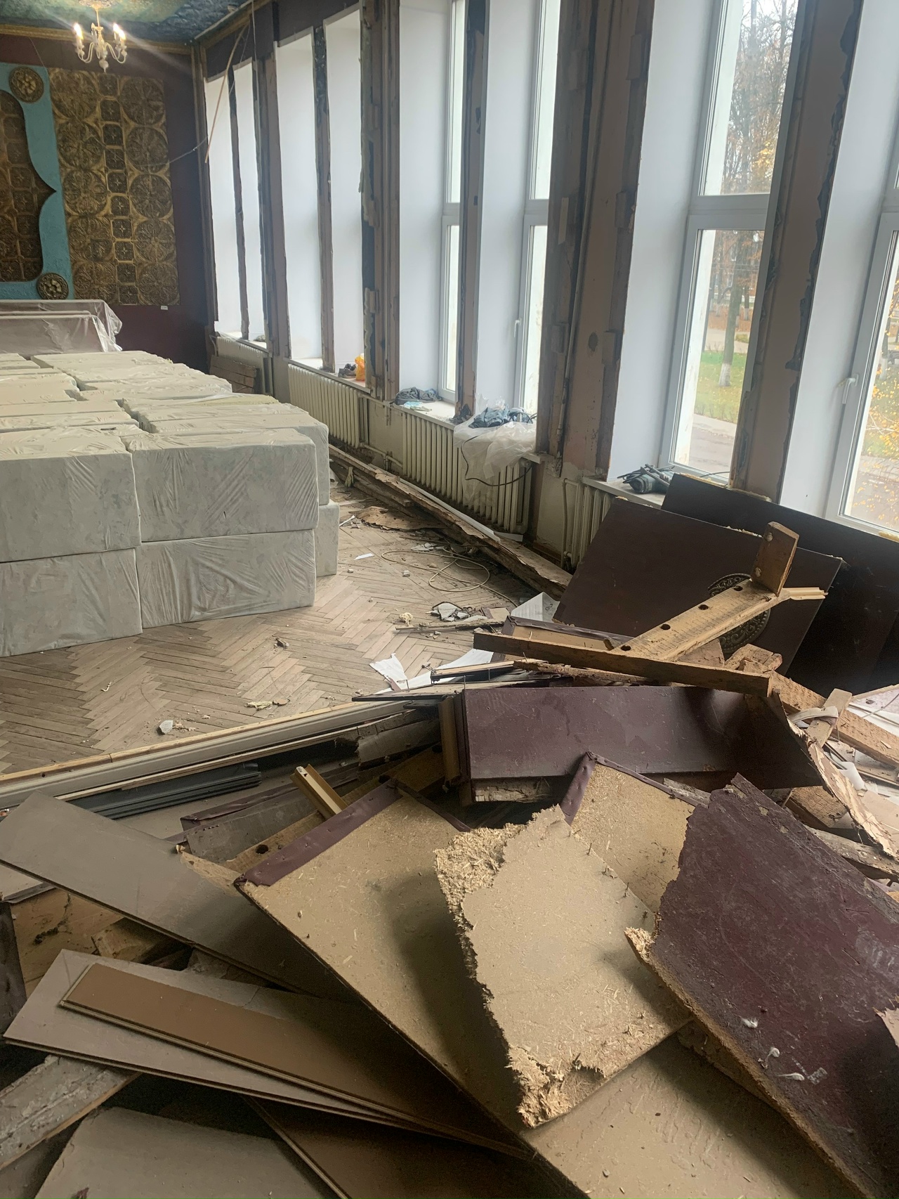 На данный момент выполнены следующие этапы: установлена обрешетка крыши, гидроизоляция, устанавливается кровля на крышу, делаются лотки по периметру для установки труб для отопления и водоснабжения, делаются полы на 2 этаже, установлены пластиковые окна, ведется демонтаж полов в актовом зале.