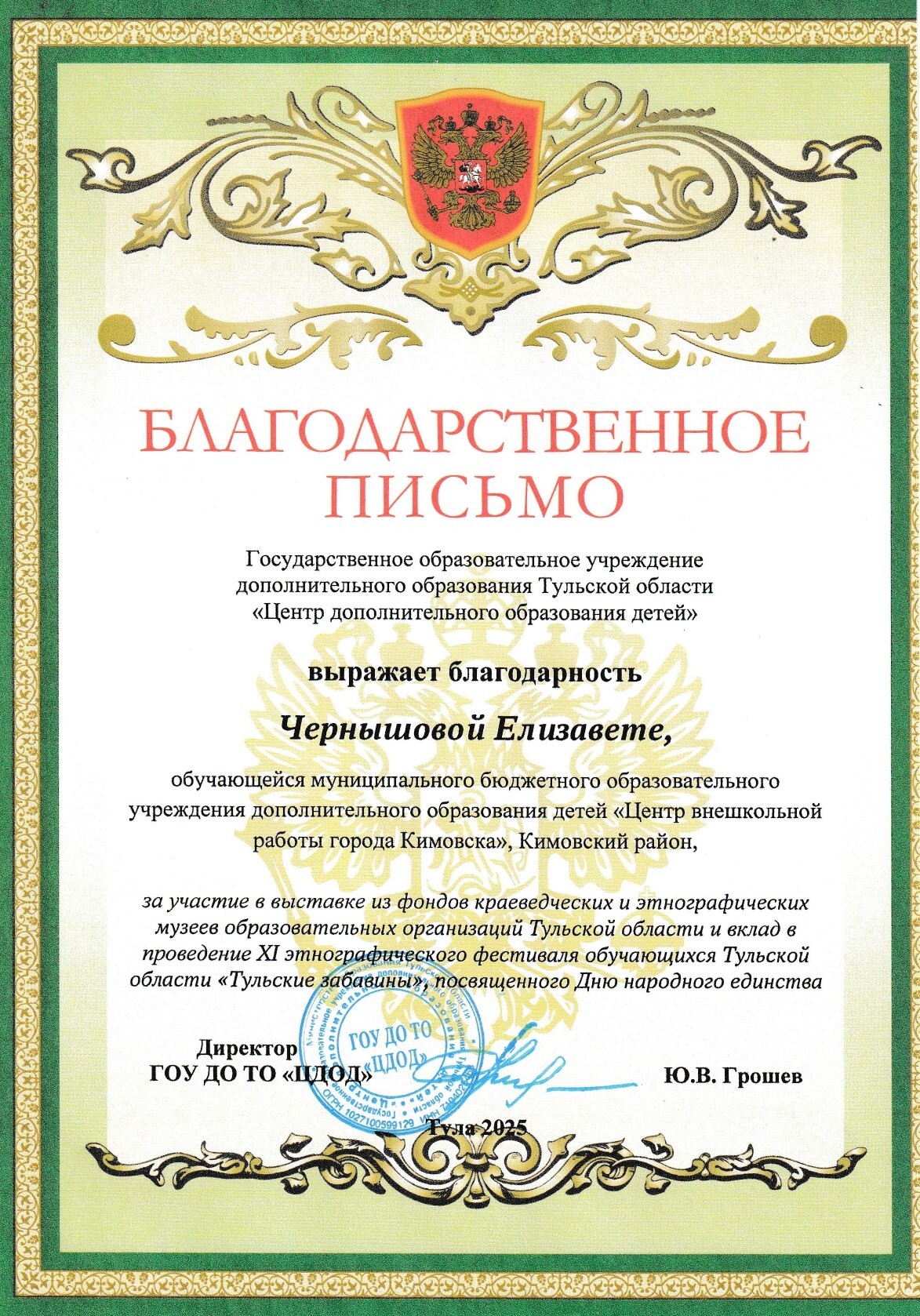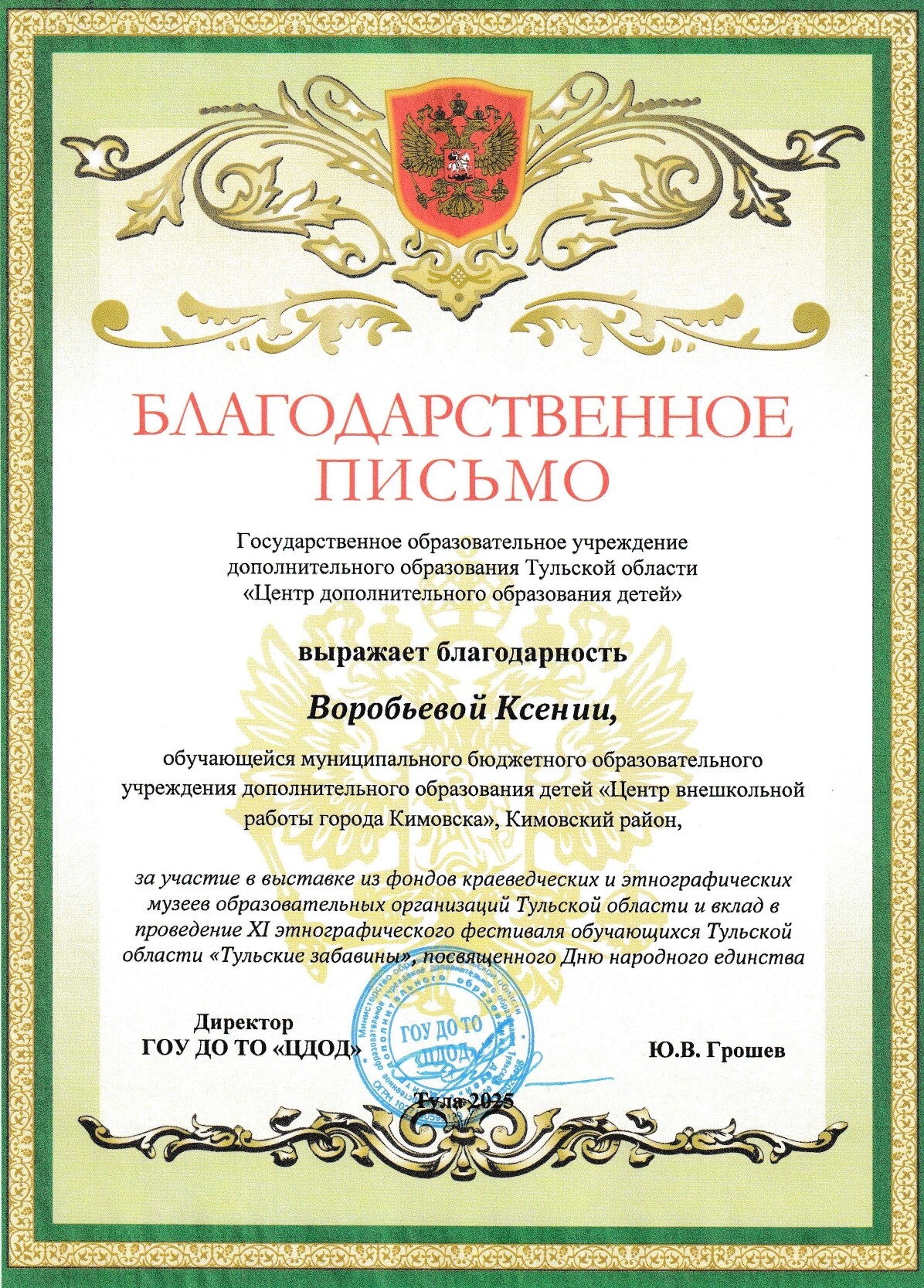 Коллектив был отмечен дипломом министерства образования Тульской области за II место в возрастной группе обучающихся 9-11 классов и благодарственными письмами.