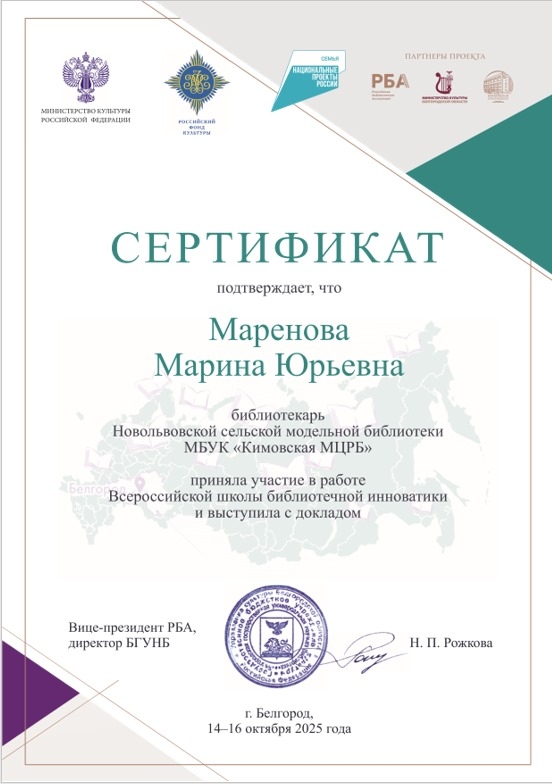 Специалист Новольвовской сельской модельной библиотеки Марина Маренова выступила в качестве спикера на Школе инноватики, её доклад был о проекте «Гений места», который был успешно реализован в Новольвовской сельской модельной библиотеке. Марина Юрьевна рассказала об опыте внедрения инноваций в сельских библиотеках.