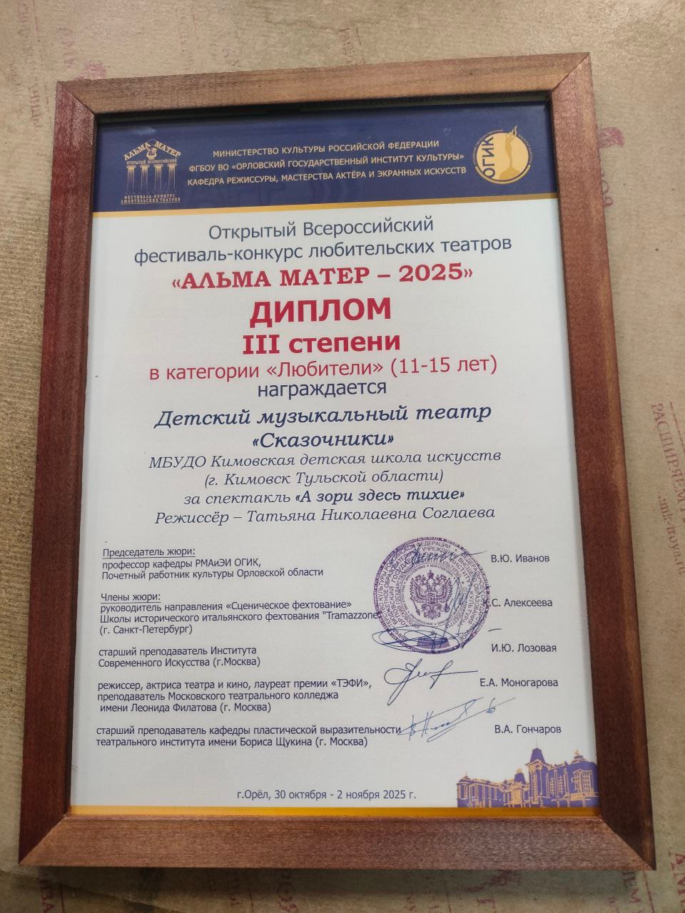 Учащиеся театрального отделения - детского музыкального театра «Сказочники» Кимовской ДШИ показали себя достойно и были награждены Дипломом 3 степени в возрастной группе 11-15 лет.