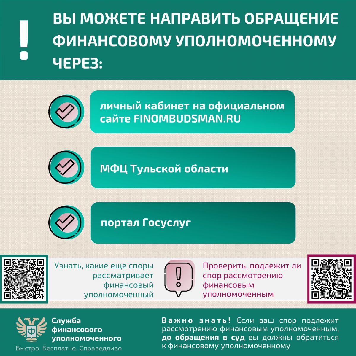 Направить обращение финансовому уполномоченному можно через личный кабинет на сайте finombudsman.ru или через МФЦ Тульской области.