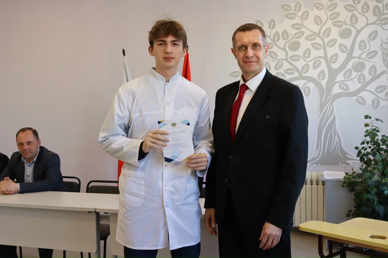 Ректор РязГМУ Роман Калинин в текущем году посетил школу №5, где вручил выпускникам свидетельства об окончании медицинского класса, которые добавили 6 баллов к ЕГЭ. Наталья Краснова отмечена Благодарностью за участие в конкурсе «Учитель партнер РязГМУ» в номинации «Профориентация».
