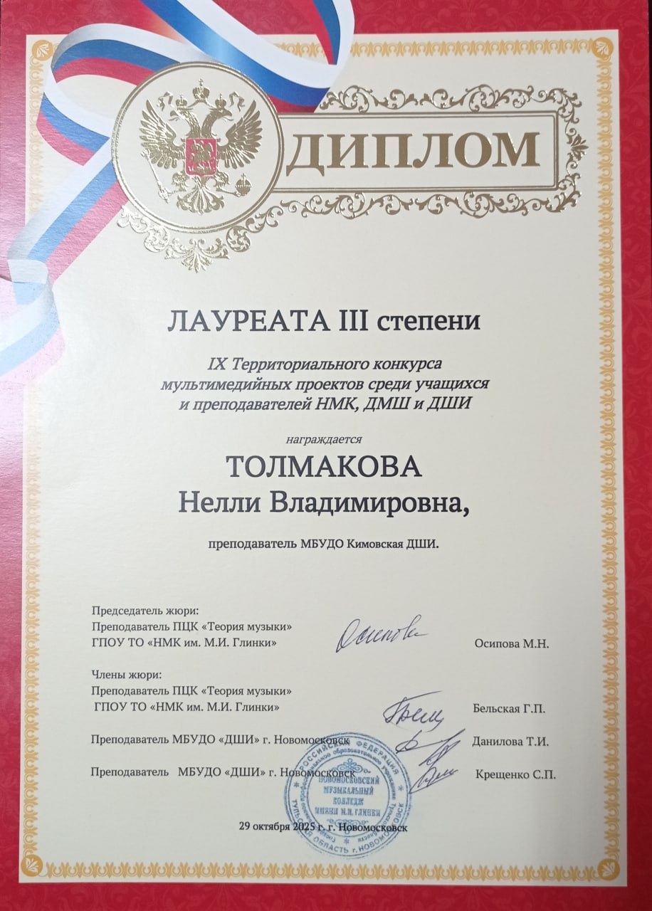 В октябре 2025 года в камерном концертном зале Новомосковского музыкального колледжа имени М. И. Глинки прошел территориальный конкурс мультимедийных проектов среди студентов ССУЗа, учащихся и преподавателей ДМШ и ДШИ.