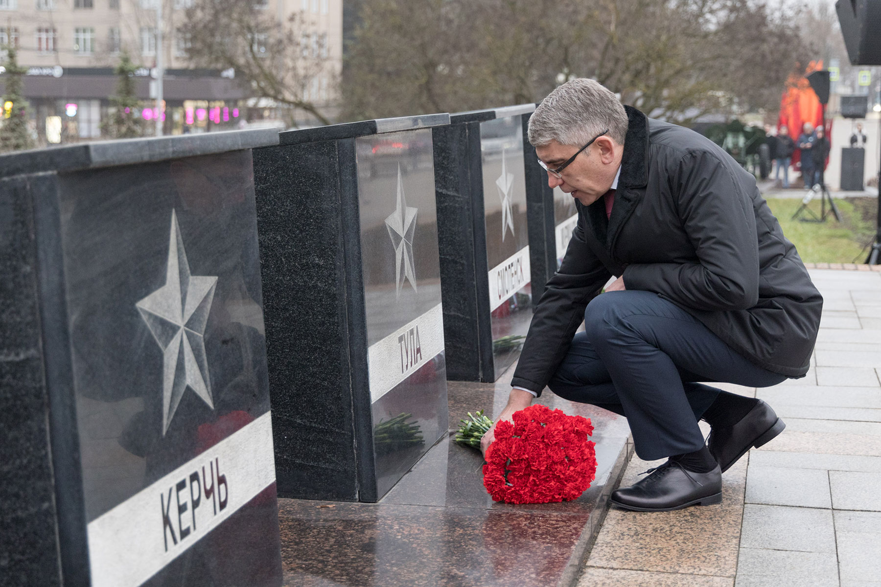 5 декабря на площади Победы в Туле состоялась церемония возложения гирлянды и цветов, приуроченная ко Дню обороны Тулы.