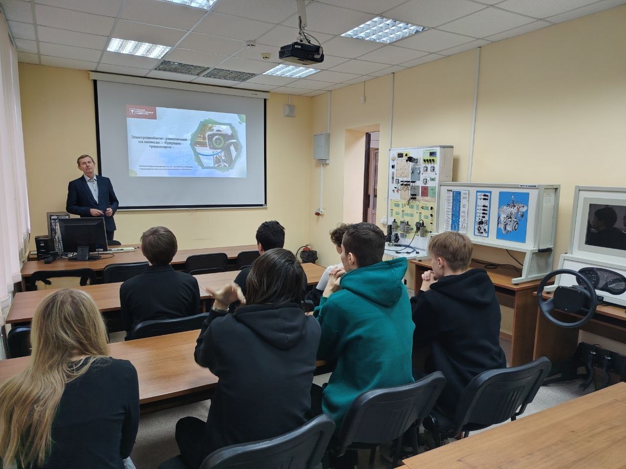 Это выступление стало настоящим открытием. Школьники погрузились в историю электромобилей — оказывается, идея электрического транспорта появилась ещё в XIX веке, но только сейчас технологии достигли уровня массового внедрения. Роман Николаевич подробно объяснил: