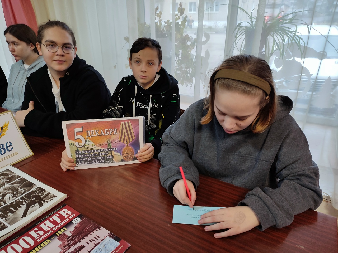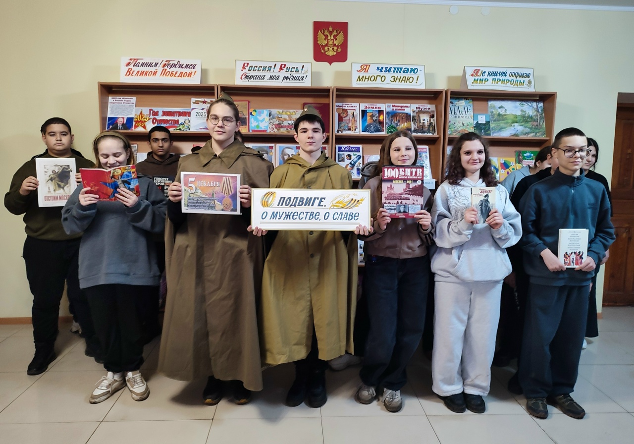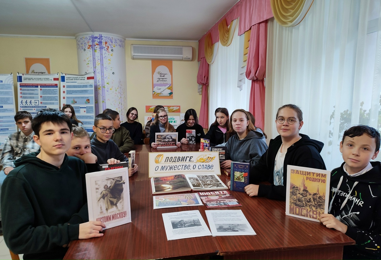 Библиотекарь рассказала ребятам о том, как развивались события в те тяжелые дни, о смелости и стойкости защитников столицы, о жизни в военной Москве. Ребята узнали о подвиге Зои Космодемьянской, о 28 бойцах-панфиловцах, о Василии Клочкове, который произнес исторические слова: «Велика Россия, а отступать некуда - позади Москва!», о Викторе Васильевиче Талалихине - военном летчике. Он один из первых совершил ночной воздушный таран немецкого бомбардировщика. Услышали о героях обороны Москвы - молодых мальчишках-курсантах военных училищ, которые в тяжелых боях смогли сдержать врага. Более 36 тысяч бойцов и командиров получили боевые ордена и награды, 180 – звания Героев Советского Союза.