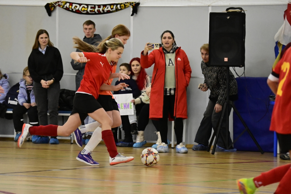 Ну а теперь мы перейдем непосредственно к спортивной части соревнований. Жребий распорядился так, что уже в первом матче сошлись команды «Возрождение» и команда ЦПЮФ «Арсенал». Игра получилась очень напряженной и держала каждого болельщика в напряжении до финального свистка арбитра. Девочки ни в чем не уступали друг другу. Совсем недавно, на первенстве Тульской области тулячки оказались сильней кимовчанок, но сегодня совсем другой матч и новое соперничество между этими коллективами. Градус борьбы зашкаливал, а болельщики лишь подогревали и без того раскаленный воздух в спортивном зале. Девчонки «выгрызали» мяч друг у друга практически вместе с паркетом. Можно сказать, что в этом матче преобладала силовая борьба, но и красивого футбола хватало тоже. Судьбу этой игры решил один забитый гол. В одной из атак нашей команды Ангелина Корионова точно пробила в угол ворот тульской команды, и мяч затрепыхался в сетке… Победа в первом матче -1:0.