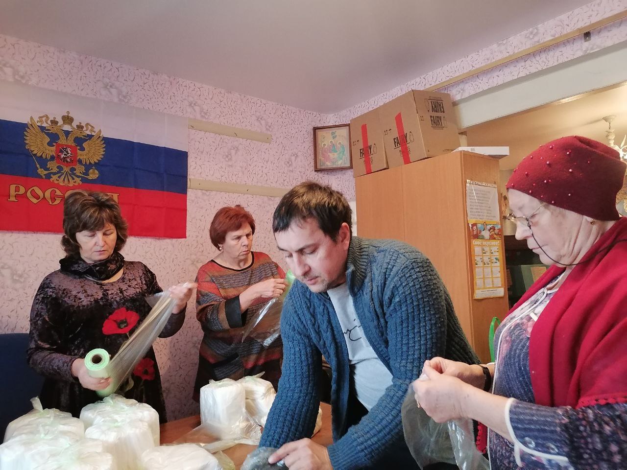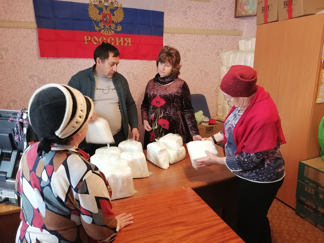 Погрузив в автомобиль несколько больших мешков с салфетками, кимовчанки возвратились в кимовский городской Дом культуры, где их ждали члены актива женсовета, которые будут заниматься расфасовкой и упаковкой этих материалов, необходимых для бойцов в полевых условиях.