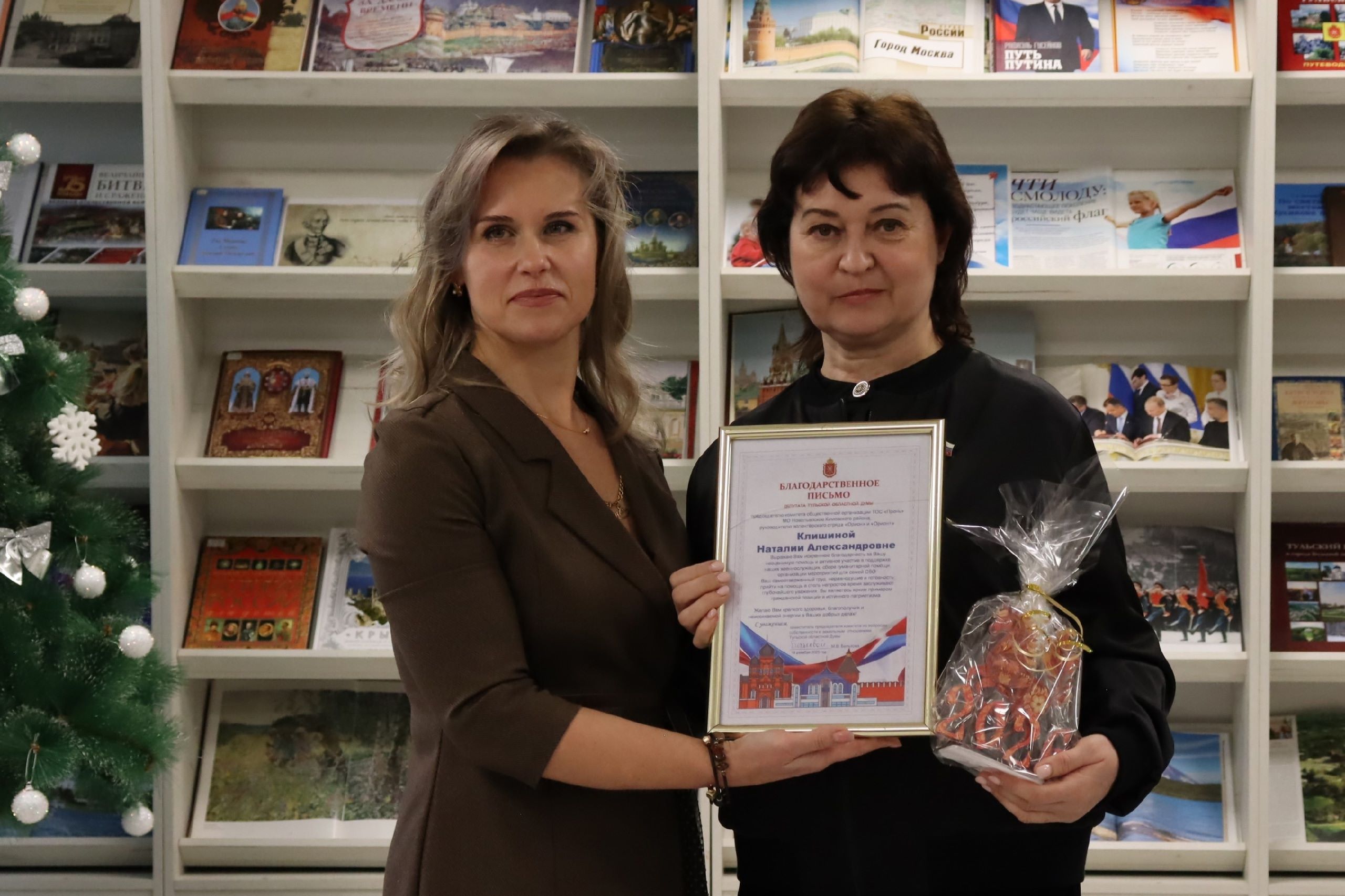 Благодарственное письмо Марина Белькова адресовала библиотекарю библиотеки поселка Пронь Наталии Клишиной, еще раз отметив ее заслуги на поприще общественной деятельности, работе по поддержке военнослужащих в зоне СВО, по сбору гуманитарной помощи.