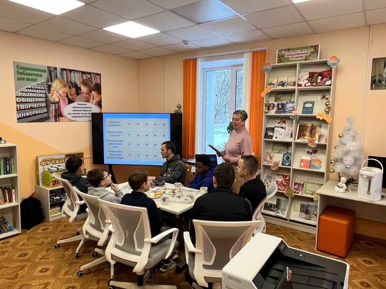 Разделившись на команды юные кимовчане сразились в интеллектуальном бою, отвечая на вопросы о новогодних традициях и обычаях в нашей многонациональной России. Победители интеллектуальной игры получили в подарок ценные книги.
