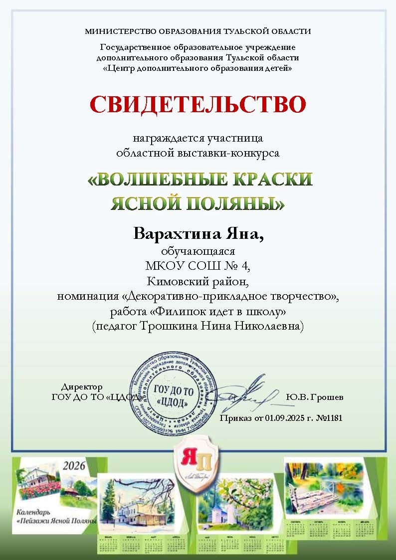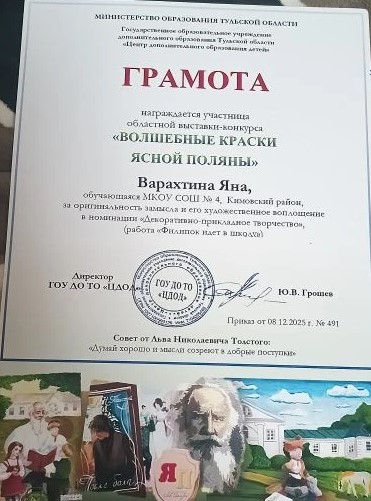 Еще одна воспитанница Надежды Николаевны, восьмиклассница Яна Варахтина приняла участие в областном конкурсе «Волшебные краски Ясной поляны» в номинациях «Декоративно-прикладное творчество» и «Изобразительное творчество». На линейке Яне вручили грамоты и свидетельства участника регионального конкурса в двух номинациях.