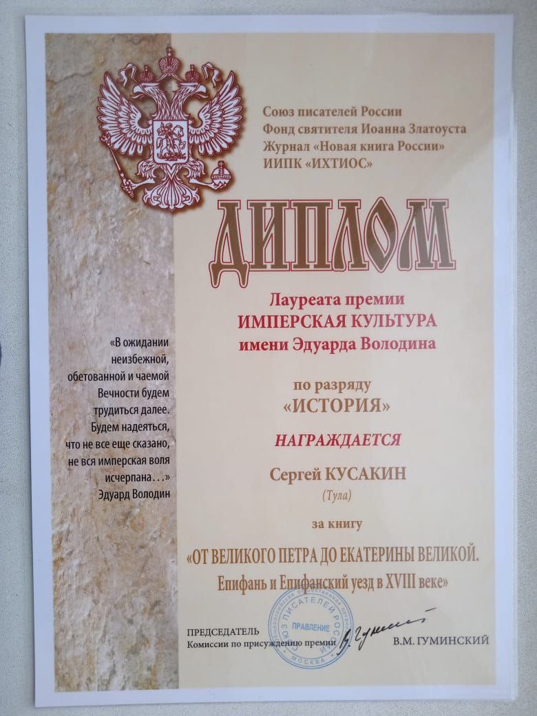 «Стать лауреатом премии «Имперская культура» - для меня огромная честь, это признание моей многолетней, кропотливой изыскательской работы по истории родного края, - делится Сергей Кусакин. - XVIII век, описанный в книге, - интереснейший период в истории нашей страны и Верхнего Подонья. Сооружение Ивановского канала при Петре I, строительство Никольского собора в Епифани в царствование Анны Иоанновны, от которого сохранились до настоящего времени колокольня и угловая башня соборной ограды, и, конечно же, формирование и становление епифанского купечества. Это важнейшие исторические события, произошедшие в регионе Куликова поля в XVIII веке».